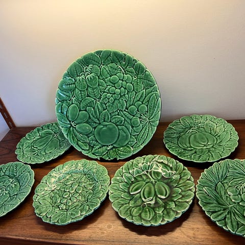 Jeg selger fem pent brukte asjetter fra franske Sarreguemines. De er antikk (fra ca 1920)