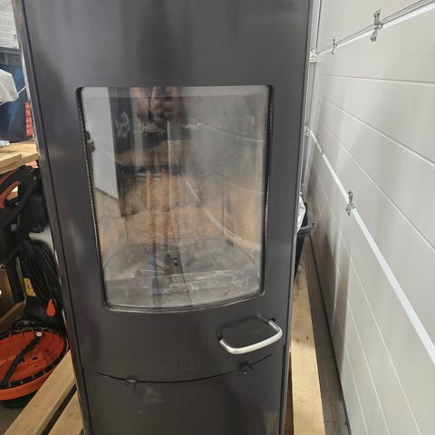 Røykrør og beskyttelsesplate i stål til gulvet følger med på kjøpet om ønskelig.