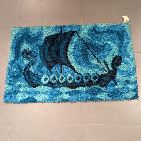 Stor maskinknyttet rye teppe med Vikinger med hjelm pyntet med horn, og Vikinge skip. 90 x 138 cm, fra EGE tæpper, i Danmark. Merkelapp er borte, men knutene viser at teppet er fra Ege, Siste bildet viser teppets bakside med de typiske Ege knutene. Kan hentes på Majorstuen eller sendes. Bruker du Fiks Ferdig, vennligst vippse meg 50 for å dekke emballasje.