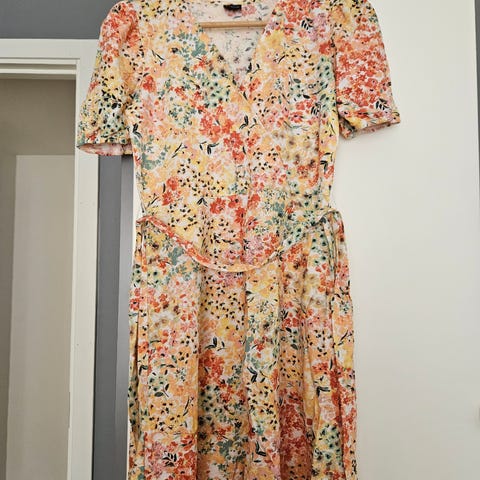 Blomstrete sennepsgul kjole.