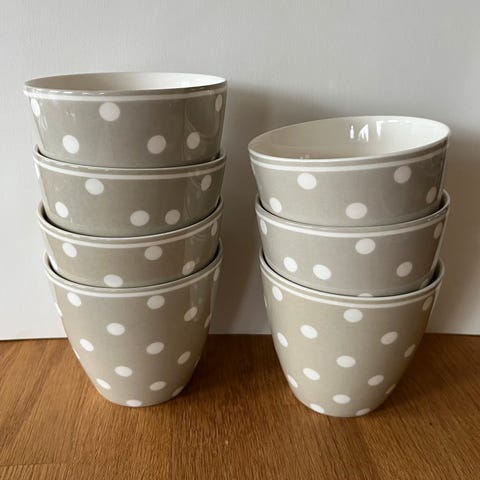 Kopper: Høyde 9 cm. Diameter 10 cm. Rommer 3,6 dl. 7 stk. Kr 85 pr stk. 🩵