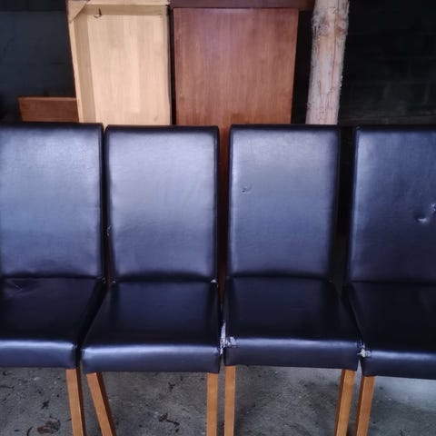 Rød stol med en defekt på beinet gis bort. Fungerer godt til tross for defekten.
