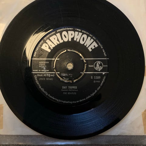 The Beatles Singel vinylplate utgitt på Parlophone. Svart vinyl med svart og hvit etikett. Passer til avspilling på platespiller. Inneholder musikk fra The Beatles.