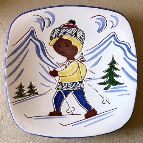 Norsk keramikk fra Graverud Sandnes, sannsynligvis fra 1960-1970-tallet. Fat /bolle i keramikk med fargerikt motiv av gutt og jente som går på ski i et vinterlandskap med snø, fjell og trær. Håndlaget i Norge. Pent og lite brukt, ingen skår. Enkelte små ujevnheter/luftboblehull fra produksjonen. Fatet / bollen har en liten fot/stett. Yttersiden har blåmalte striper.