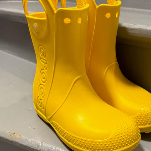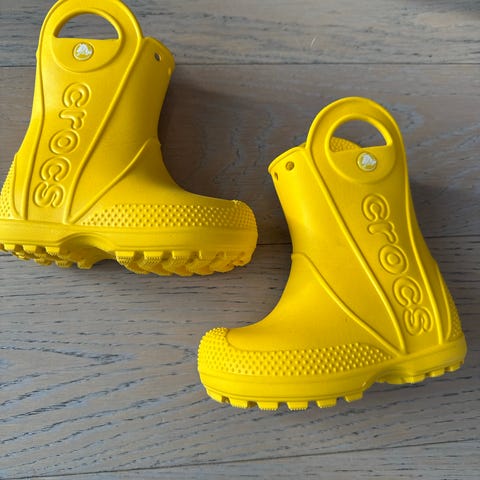 Crocs barn regnstøvler i størrelse 32/33gul farge, egnet for både gutter og jenter. Laget av vanntett materiale med håndtak for enkel på- og avkledning. Designet for å beskytte mot vått vær.