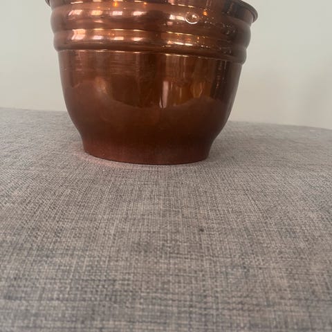 Dekorativt, lite kobberbeger 9 cm høyt og 8,5 cm i diameter.