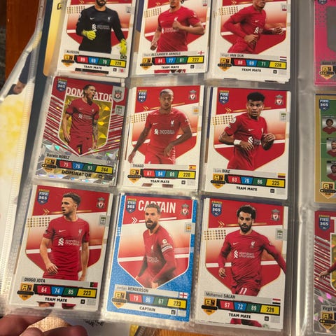Selger en bunke med fotballkort i metallboks, 22 kort