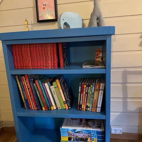 Smal hylle til barnebøker, noter eller lignene. Lengde 75cm , høyde 35cm, dybde 10cm