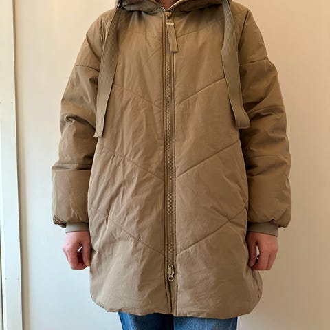 Stor i str er mer som en S/M. Vide armer så her får du plass til en god jakke/genser under. Sidelommer med magnetknapper pluss innerlomme. Skjult glidelåslukking.
