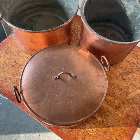 To kobberkjeler i ulik størrelse. Selges hver for seg 100,- eller samlet 180,-