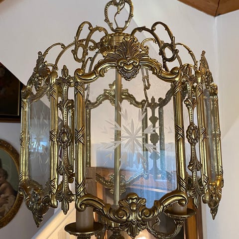 Selger gammel jugendstil parafinlampe i messing. Lampen er satt inn vanlig pære i. Trolig er denne fra tidlig 1900 tallet. Den er stor og krever god takhøyde.