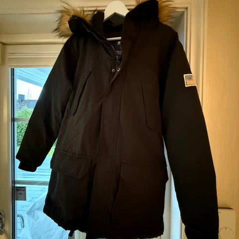 Nydelig formsydd boblejakke med fine detaljer. Som ny. Str S