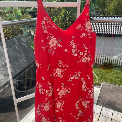 Rød sommerkjole med fint mønster i størrelse XS. Kjolen har lange ermer og knapper foran.