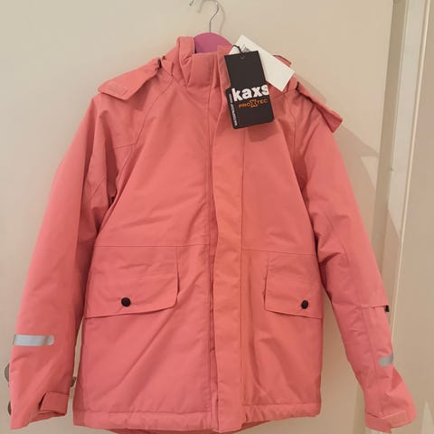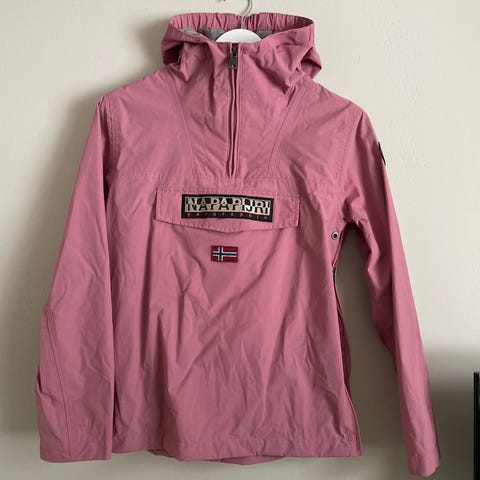 Jakke kjøpt med aldri brukt. Den har en nydelig rosa farge, med hette, glidelås på siden, og tynt foret.