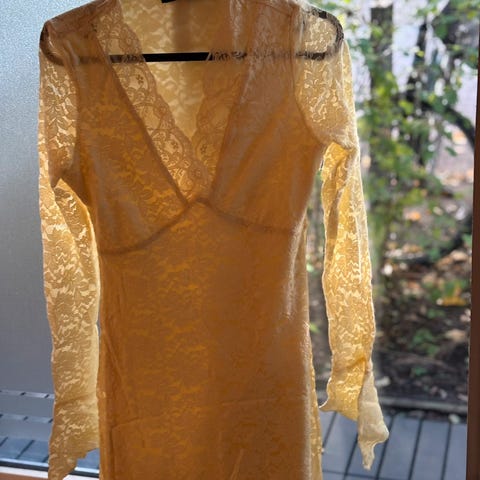 Lekker kjole i lett kremfarget tone med blomsterprint. Den har lange ermer og en fin åpning foran som gir den et ekstra feminint preg.
