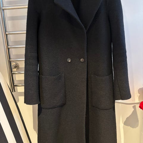 Klassisk mørkeblå ullkåpe fra Hugo Boss. 70 % ull og 10 % kashmire. Kåpen er cirka 90 cm lang. I meget god stand. Ett hull i foret på venstre erme, eller helt uten skader.