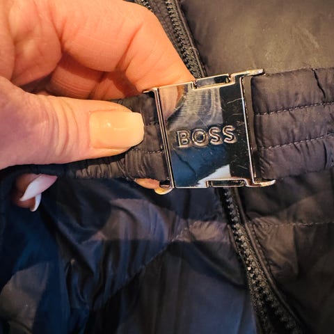 Kåpe fra Hugo Boss i mørkeblå farge, størrelse 36. Jakken har et belte med metallspenne og er laget i et materiale som krever skånsom vask.