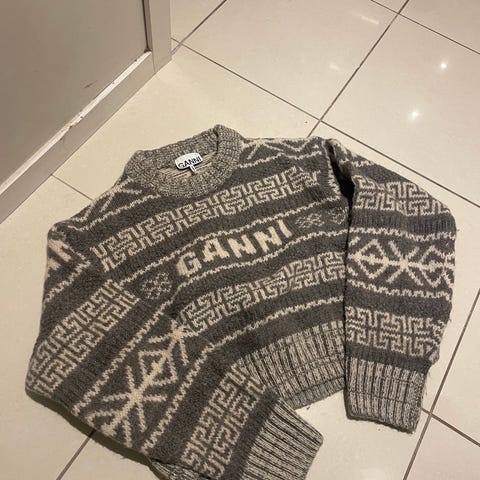 Ganni genser i grå farge, størrelse M. Genseren har et strukturert mønster og er laget for kvinner. Passer til hverdagsbruk og kan kombineres med ulike antrekk.