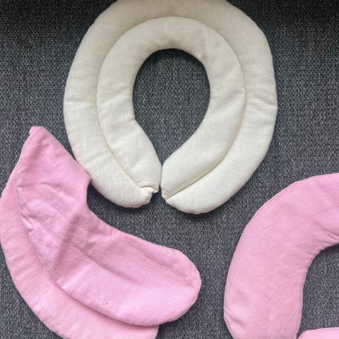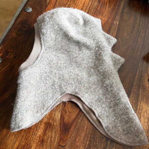 Strikket sitteunderlag med ører. Strikket i Fritidsgarn fra Sandnesgarn, og deretter tovet, noe som gjør sitteunderlaget varmt og slitesterkt.