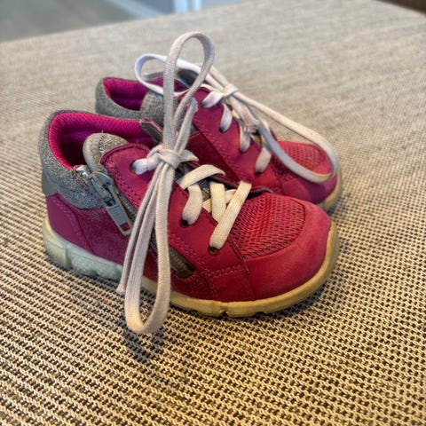 ECCO barnesko for jente i størrelse 21. Skoene er rosa med detaljer i lilla og har snøring. Laget i materialer som gir god passform og komfort for barnets føtter.