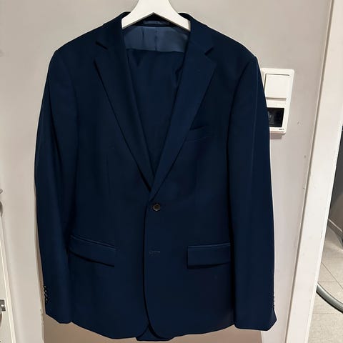 Dressmann dressjakke og bukser i blå farge, størrelse 50 for menn. Dressjakken har en knapp og klassisk snitt, mens buksene har en smal passform. Passer til formelle anledninger eller forretningsbruk.