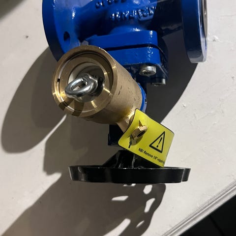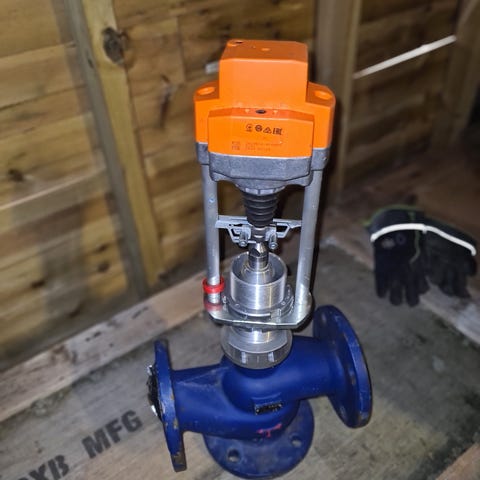 Belimo Exa-JS04A motorisert ventil med en diameter på 110 mm. Ventilen er laget av blått stål og utstyrt med en elektrisk aktuator for styring. Produktet er beregnet for bruk i industrielle eller tekniske systemer som krever regulering av væskestrøm.
