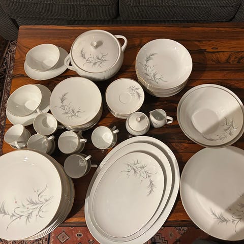 Står Thomas Germany under koppene og asjettene. Tallerkene har ikke merke under, men passer i stil.
