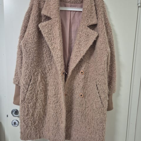 Flott olivengrønn kåpe med både ull og angora i. Se kapp på bilde. Den er halvlang og med magnet knapper. Ingen flekker.