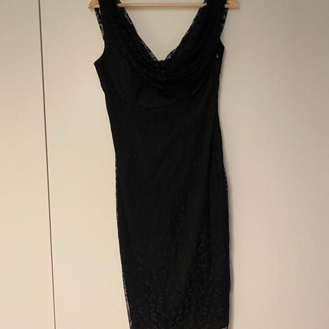 Riccovero festkjole i størrelse 38, svart farge. Kjolen har tynne stropper og er laget med en teksturert, rynket overflate foran. Den har glidelås på baksiden og er foret med et glatt materiale. Anbefalt håndvask med kaldt vann uten blekemidler. Kan brukes med og uten stropper, skikkelig kul kjole, ‘den lille sorte’