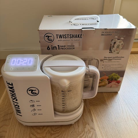 Selger en fint brukt foodprocessor for tilberedning av førstematen for spedbarn. Er blitt bittelitt oransje etter damping av gulrøtter. Selges derfor billig.