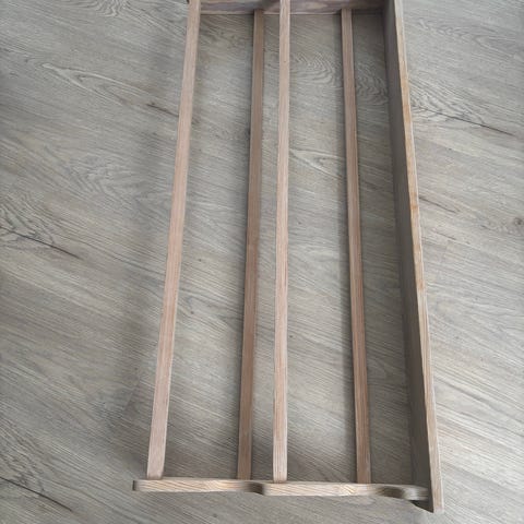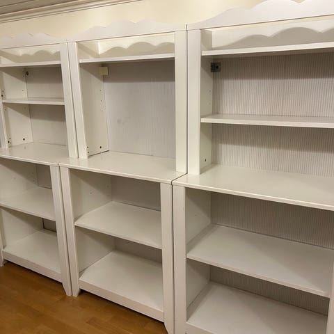 Som avbildet. Hylleplatene er litt bøyd fra vekten av bøkene som har stått på den. Noen hull i sidene fra innfestning i andre møbler, men ellers ganske pent brukt. Må hentes på Sørumsand.