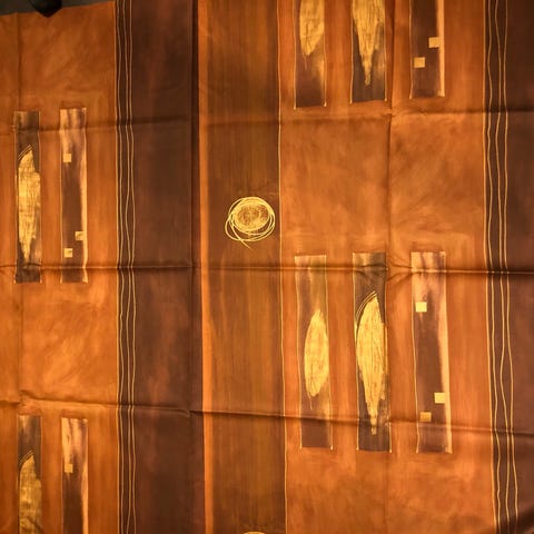 Et nydelig stykke stoff, lys gul, dobbeltvevd, med gull i mønsteret, kraftig, glansfullt. Oppfører seg litt stivt ved drapering. Vanskelig å få fram gulfargen på bildet.