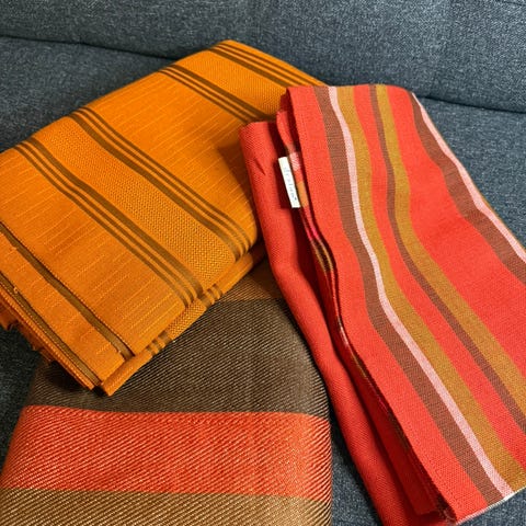 Gardiner fra 1970-tallet i tidsriktig dempet oransje! (Bilde nr 2,4 og 5 er best mtp fargegjengivelse.) Det er 6 ‘deler’; 2 store fag (lengder) á ca 210 cm bredde og 175 høyde - 2 små fag (lengder) á ca 120 bredde og 140 høyde - 1 kappe (overkappe) bredde ca 325 og 1 kappe bredde ca 1,75. Ytterkantene er 25 cm pluss blondekant og i midten er de ca 20 cm pluss blondekant. Ufôrede gardinlengder mens kappene er fôrede! De har ligget innpakket! (Kan sendes med Postnord kr 69,-.) Selger alt for 275,-