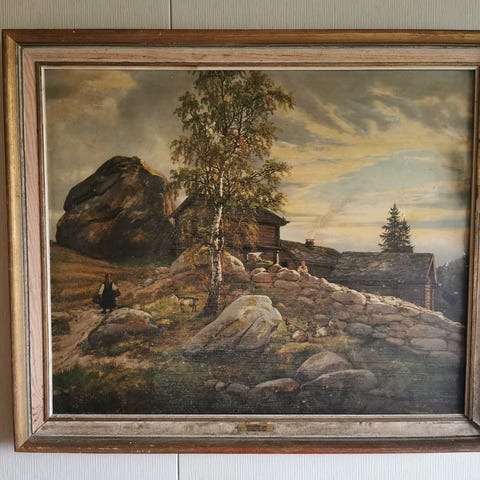 Flott innrammet reproduksjon av Hans Gude sitt berømte maleri Til seters. Originalverket er et av de mest kjente i norsk kunsthistorie, og denne reproduksjonen gir et vakkert innblikk i nasjonalromantikken.
