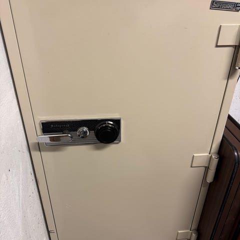 Stor safe med kodelås og hylleoppbevaring.