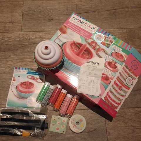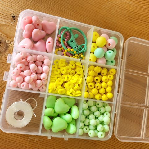 Søkeord: blå perler, gule perler, lilla perler, fiolett perler treperler perling lag smykker hobby for barn