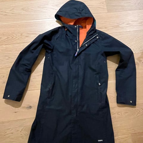 Selger en klassisk og solid Blæst City Coat, designet av Lisbeth Lillebøe. Frakken er laget i et tykt regnfrakk-stoff. Dette gir svært god beskyttelse i ruskevær, men materialet er mindre pustende enn moderne skalljakker.