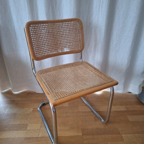 Tre stk gamle stålrørsstoler med armlene som kan stabled. Stål ramme i en veldig fin lys grå, nesten gråblå farge, og finér sete og rygg. Mye patina og sjarm, men stødige og gode. Like fine på spisestua som på kontoret.