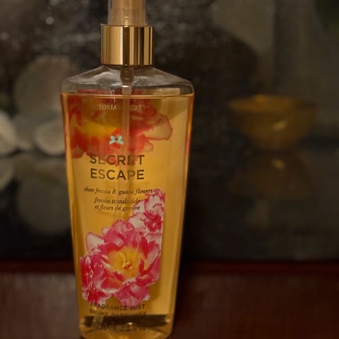 Flasken viser Victoria's Secret Secret Escape Fragrance Mist, en blomsterduftende kroppsspray.
