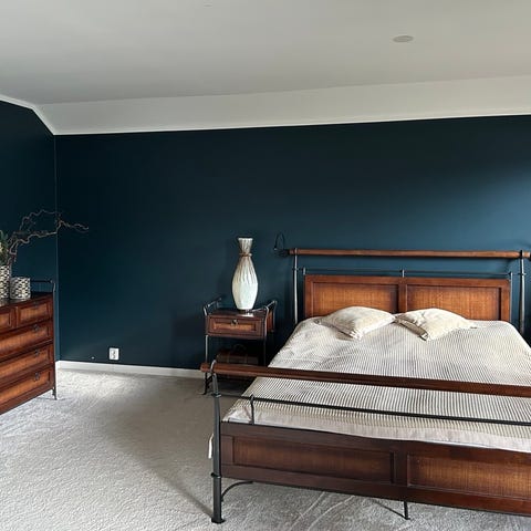 Seng, soverom, soveromsmøbel, kommode, puff, nattbord