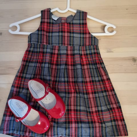 Julekjole mørk röd ( fra Gullkorn Design) str 74/80, men jenta mi brukte den når hun brukte str 86 også. Stoffet er elastisk.