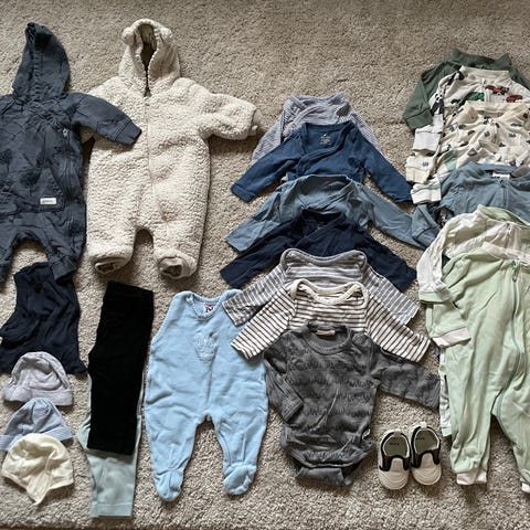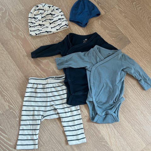 3st outfits med body og selebukse til liten gutt/jente, pent brukt! Bukser fra Newbie er 30% lin. Ingen anmerkninger 🌻