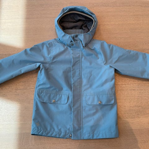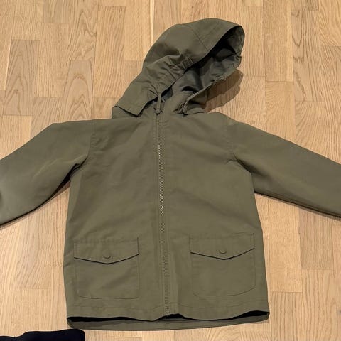 Polarn O. Pyret jakke i størrelse 128 for gutt. Jakken er grønn og har hette. Den har to store lommer med klaff og knapp på forsiden. Innsiden er foret med boble materiale for ekstra varme. Innsiden kan fjernes.