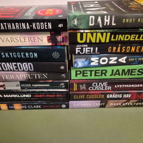 Diverse krimbøker selges. Bøker kr 40 pr stykk. Pocketbøker kr 25pr stykk. Kan hentes på Brattlikollen eller sendes. Kjøper betaler frakt. Kan selges separat
