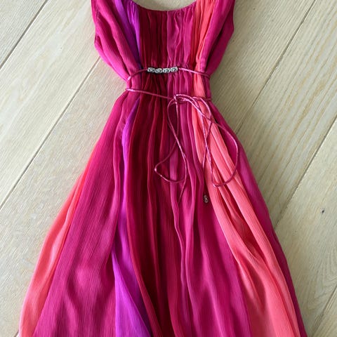 Merrytime Pen selskapskjole i duse høstfarger, lett bluse/jakke i samme stoff, men lett»krøllet» som gir en fin effekt. Litt volang i nedkant på kjolen. Lengde til ned på legg. Brukt kun to ganger. Blusen er fin til andre skjørt og bukser også.