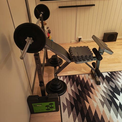 Det følger med silikonoje x2 (brukes for å ta vare på tredemøllen), beskyttelsesmatte (beskytter gulvet den står på), og ellers tilbehør som ledning og bruksanvisning osv.
