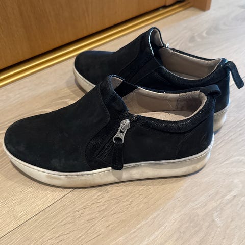 Veldig behagelige sko, god å gå i, semsket skinn i svart fargen,sålen er brun