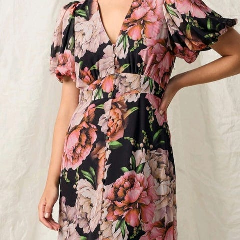 Selger ubrukt kjole fra Bubbleroom. Puff sleeve ankel dress i sort med et rødt og rosa blomstertrykk. Str.44 (XL).