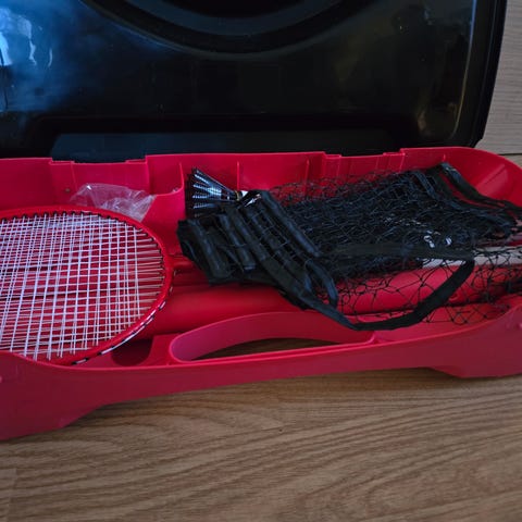 Innhold: Settet inneholder vanligvis to badmintonracketer, fjærballer (shuttlecocks) og et nett med stolper for oppsett.