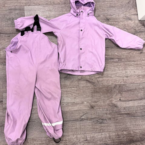 Cubus rosa regnjakke og regnbukse for jente i størrelse 128. Sett består av jakke med hette og bukse med seler, laget for å beskytte mot regn og fuktighet.